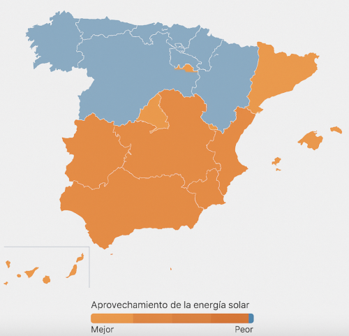 El siguiente mapa indica las zonas de España donde se aprovecha mejor la energía solar: